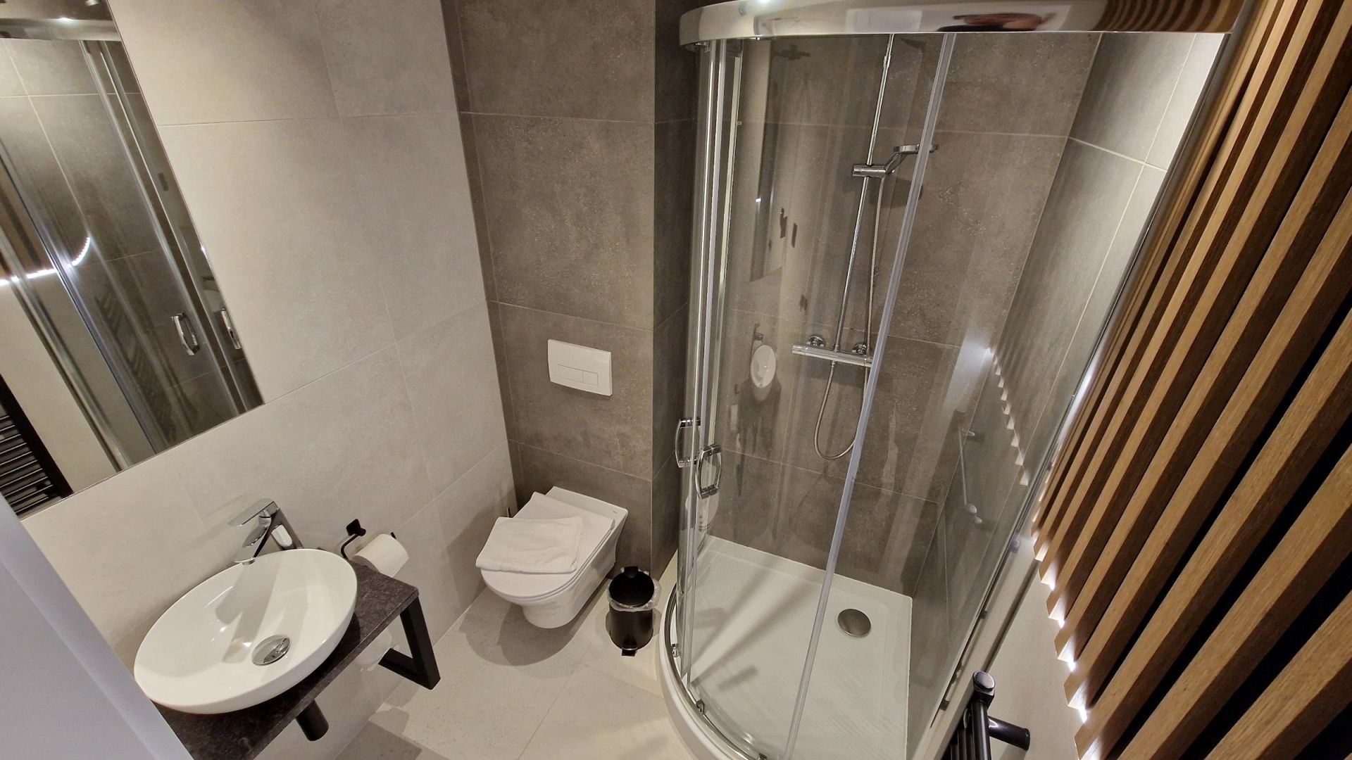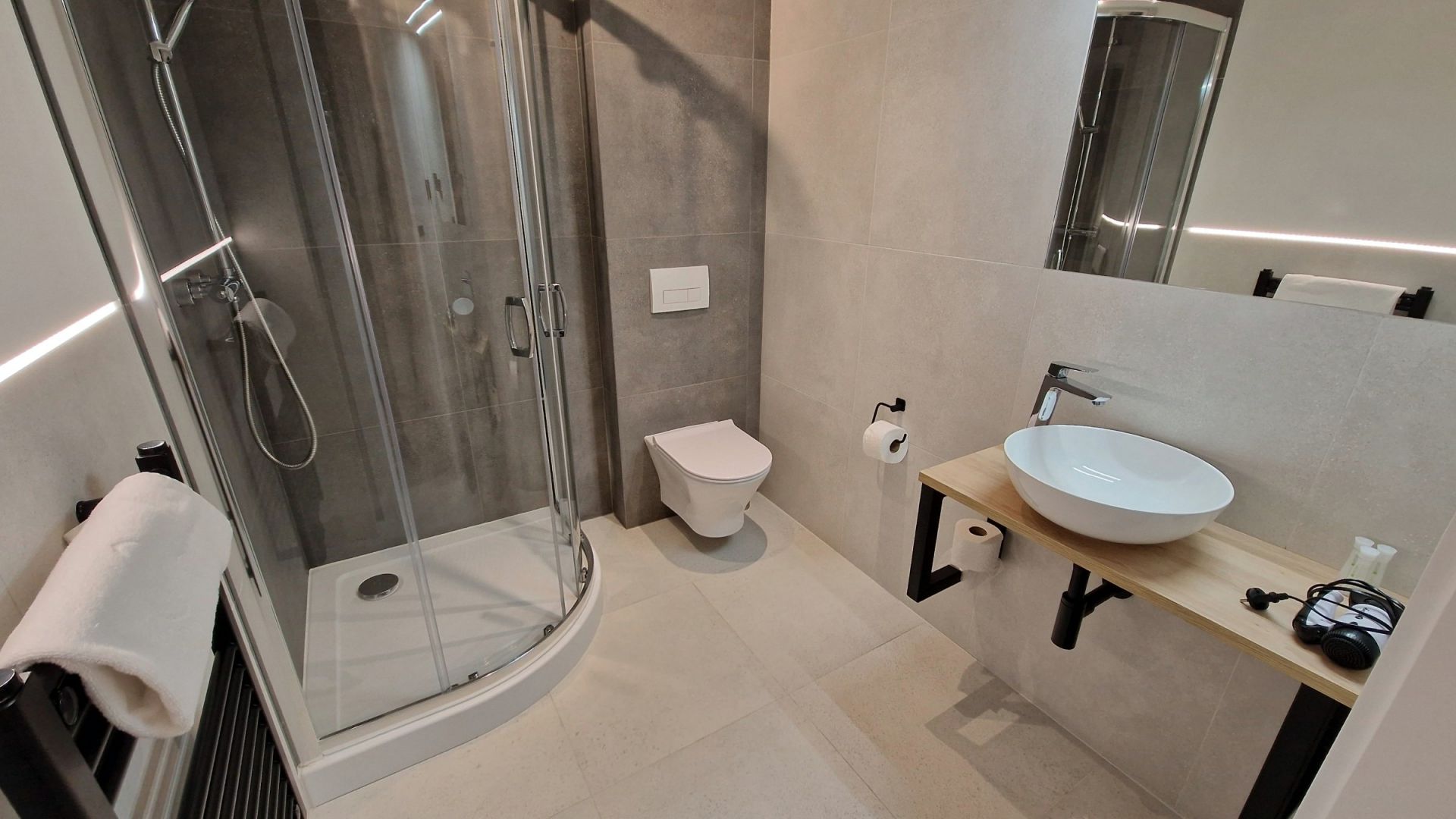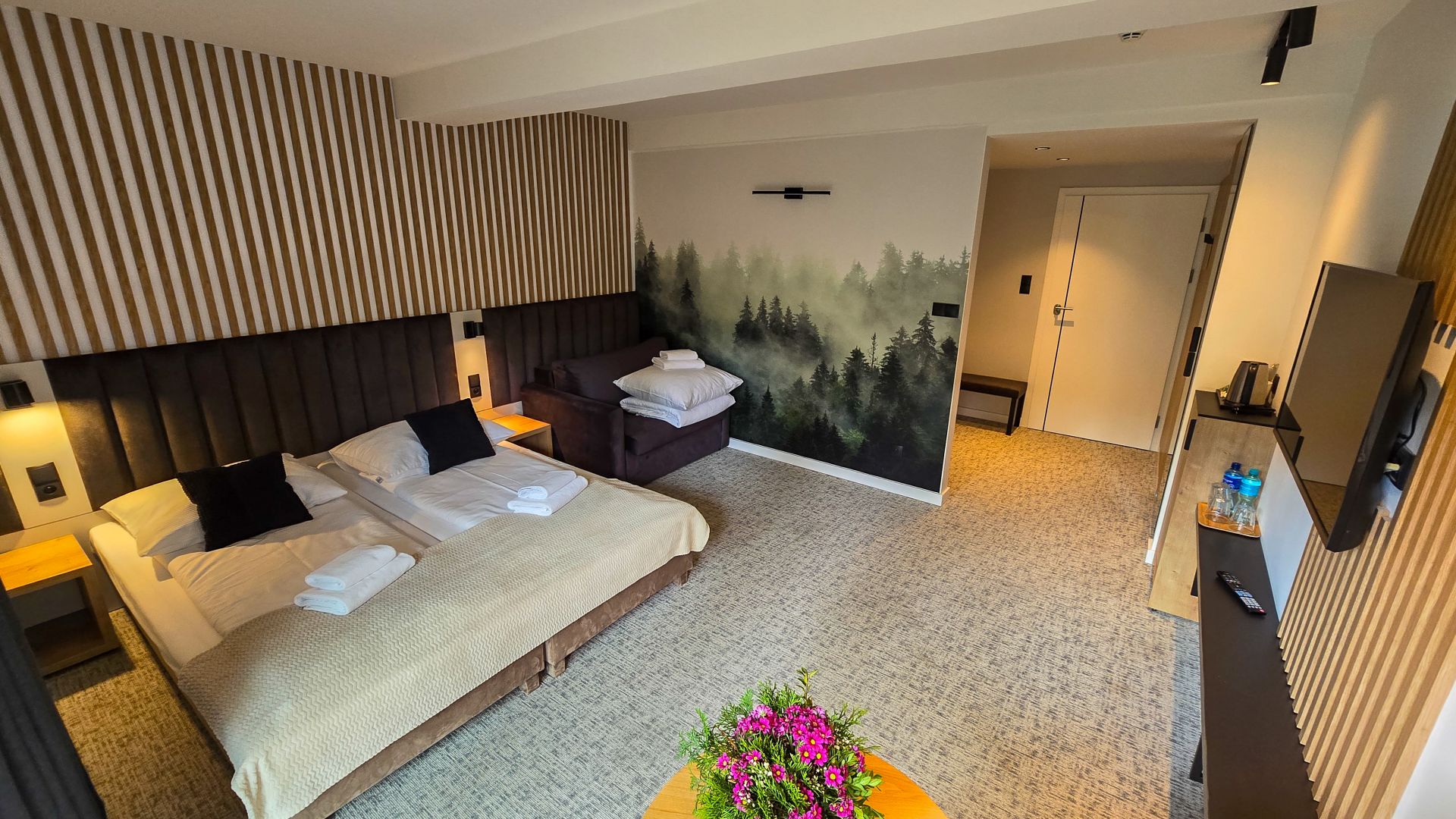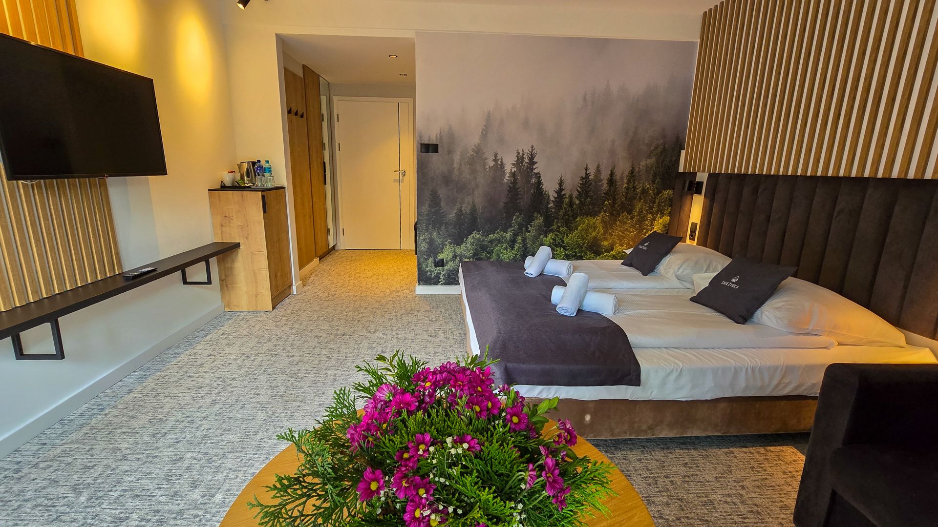 A perfect room for families with a child. Two single beds joined together (can be separated) and a single sofa bed. Modern furnishings and amenities that highlight the room’s standard, along with a wonderful balcony view of the Beskids panorama – all of this creates an unforgettable atmosphere, ideal for complete relaxation and rest.